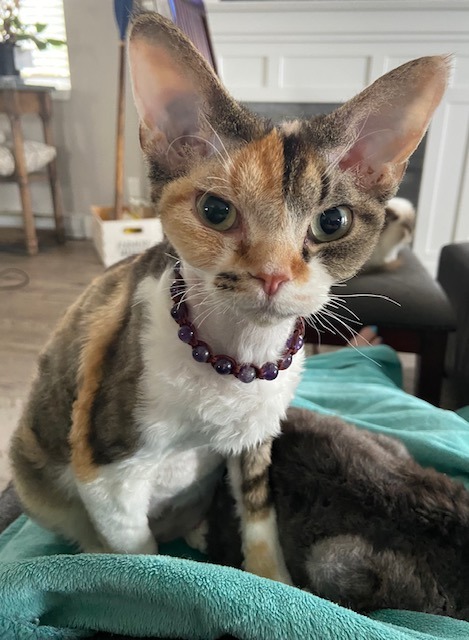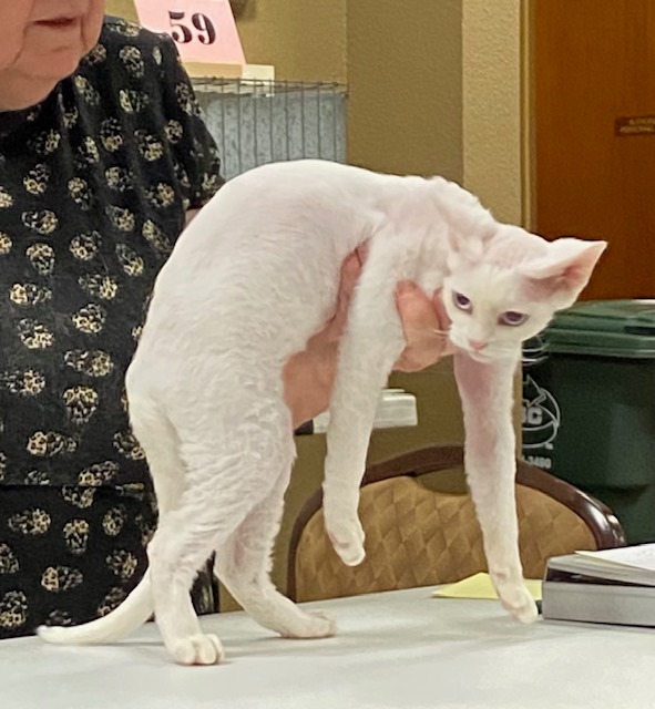 Astrid is a little angel. She has a soft voice and a gentle way about her. She came to us as a kitten from Odessa, Ukraine via a Devon Rex rescue mission. Some of those rescued went to pet homes and others like Astrid, came with breeding rights to registered breeders like us. She's a delight to have in our home.